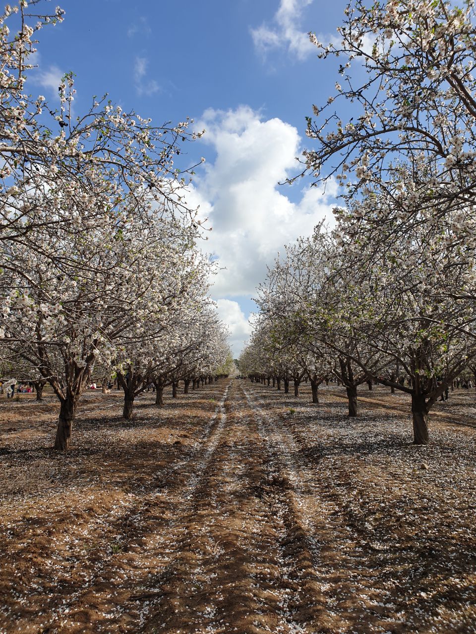 במטעי השקדיות תוכלו לראות שורות שורות של עצים.