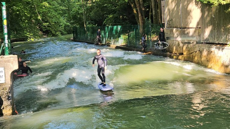 זאת חוויה מגניבה ובעיקר מוזרה לנו שכן הם גולשי גלים באמצע נהר בלב העיר מינכן.