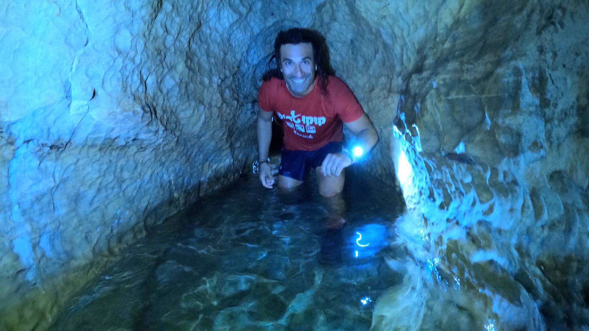 נסיעה מתוך נקבה ארוכה של כ- 60 מטרים עם מים צלולים כתכלת
